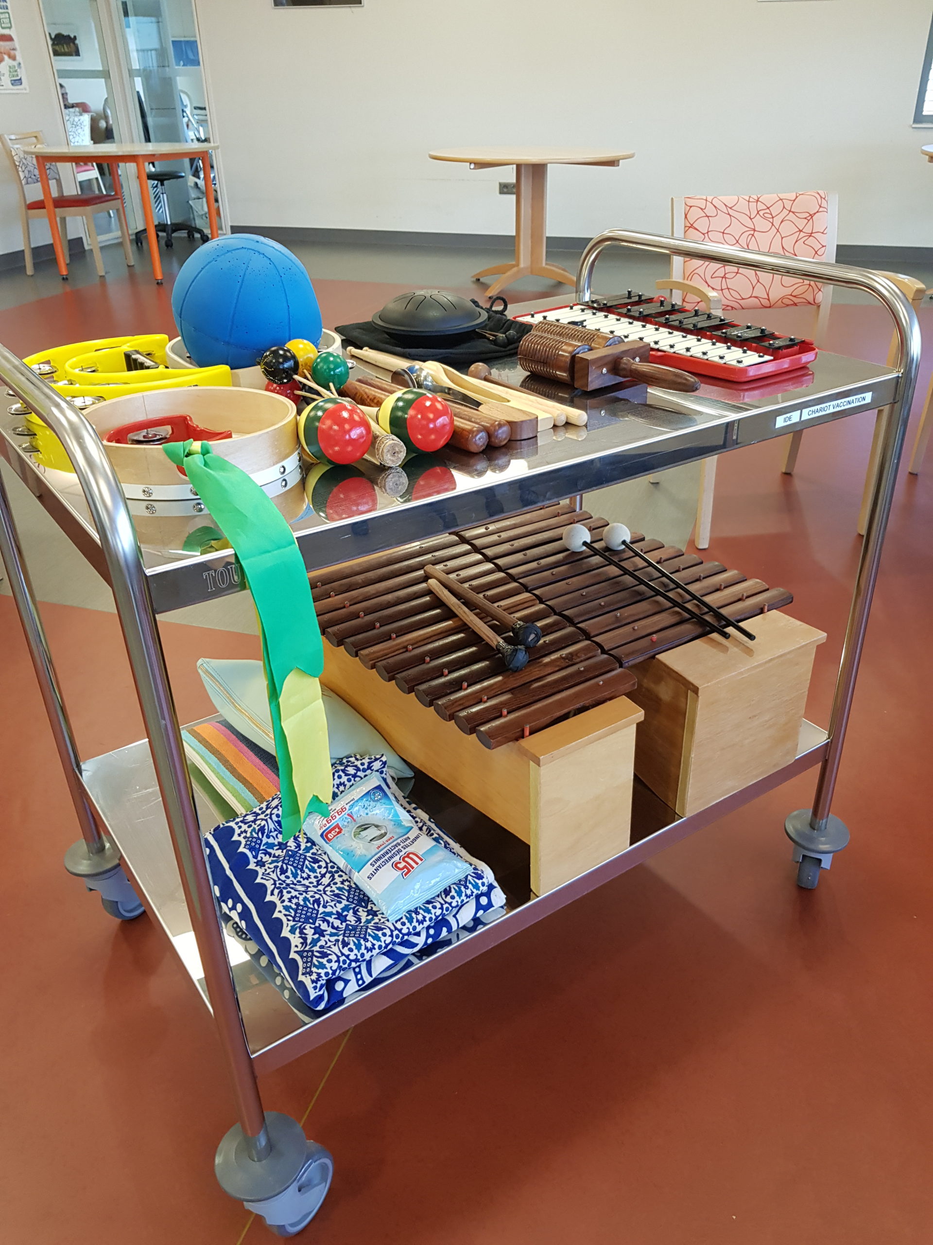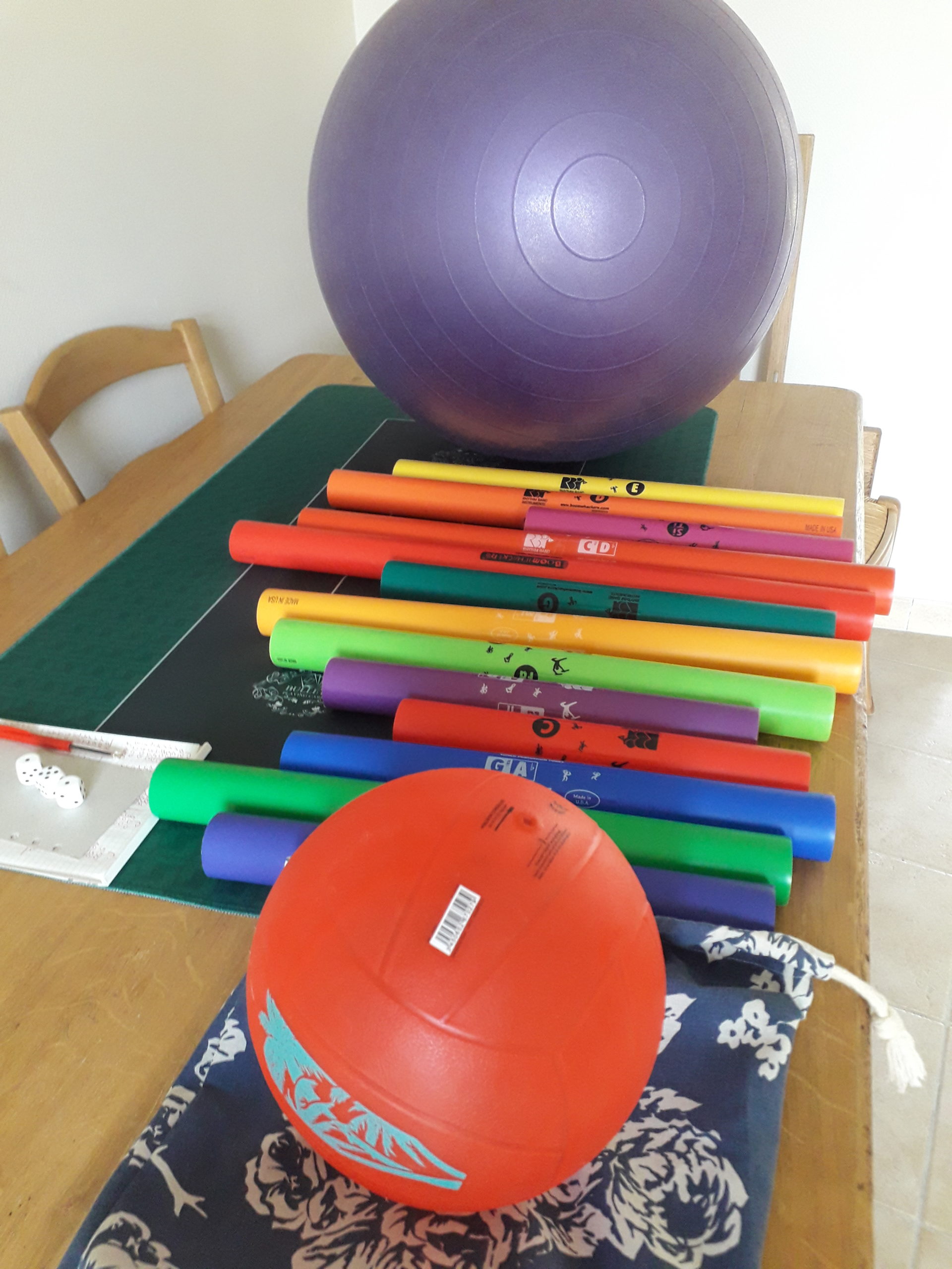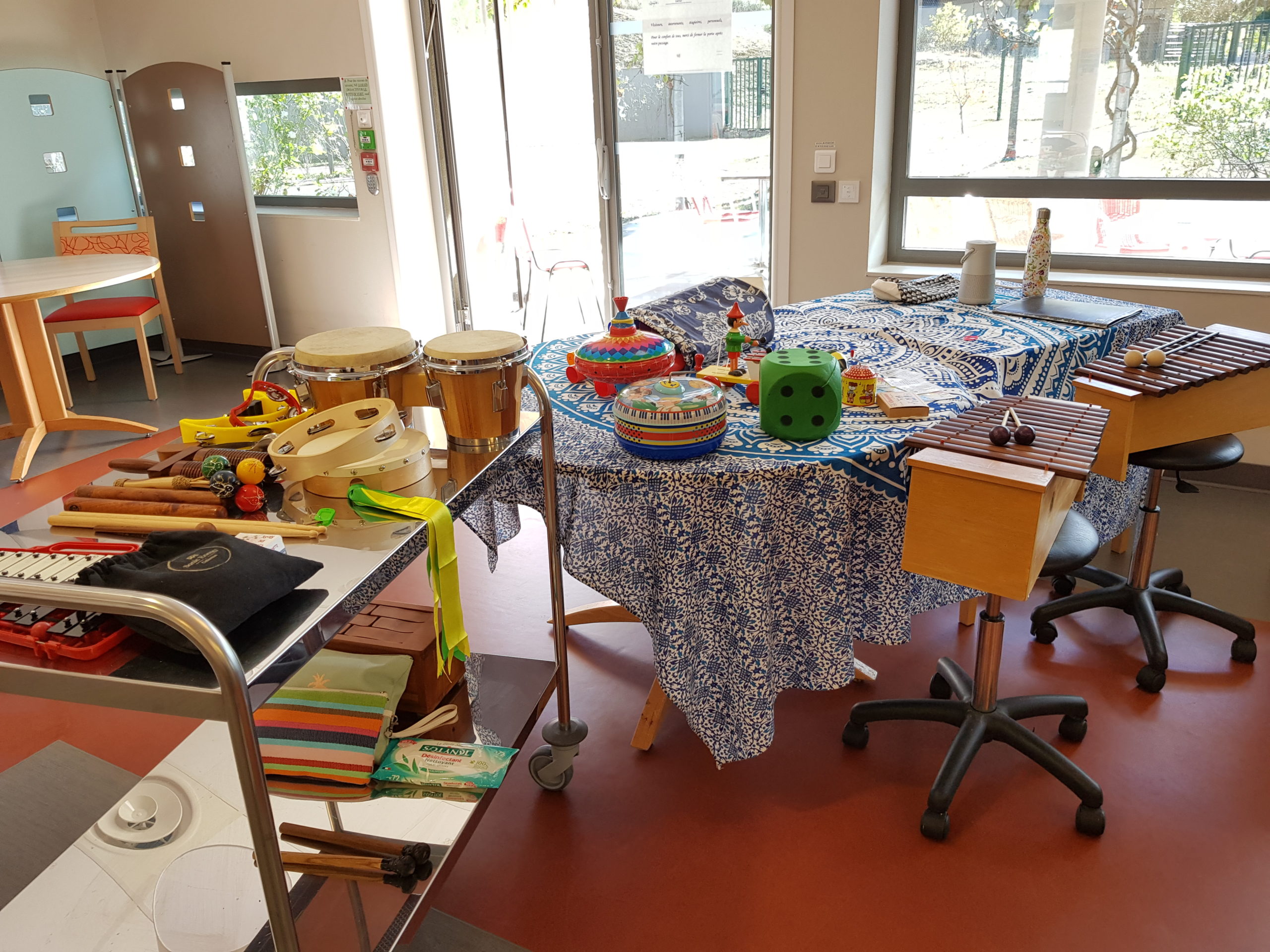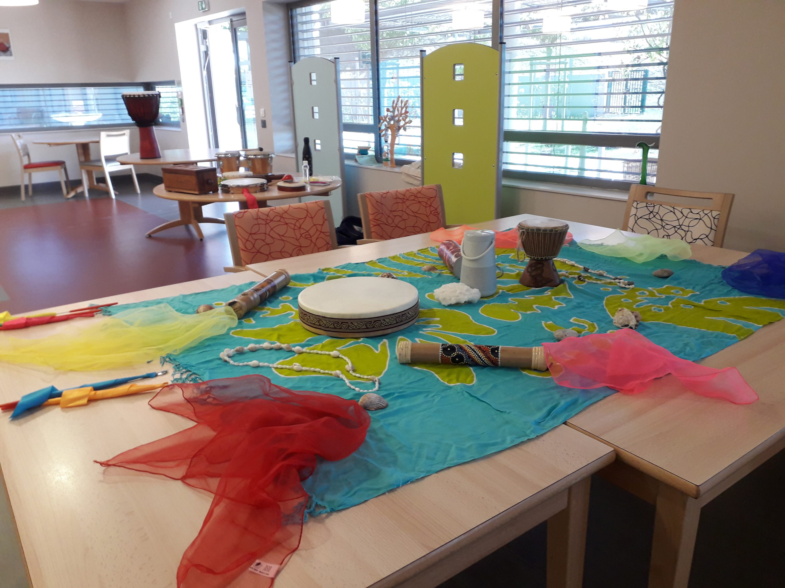 • J’utilise l‘environnement du quotidien, en plus de l’instrumentarium, en stimulant le sensoriel : objets, éléments naturels, foulards, origamis, masques…